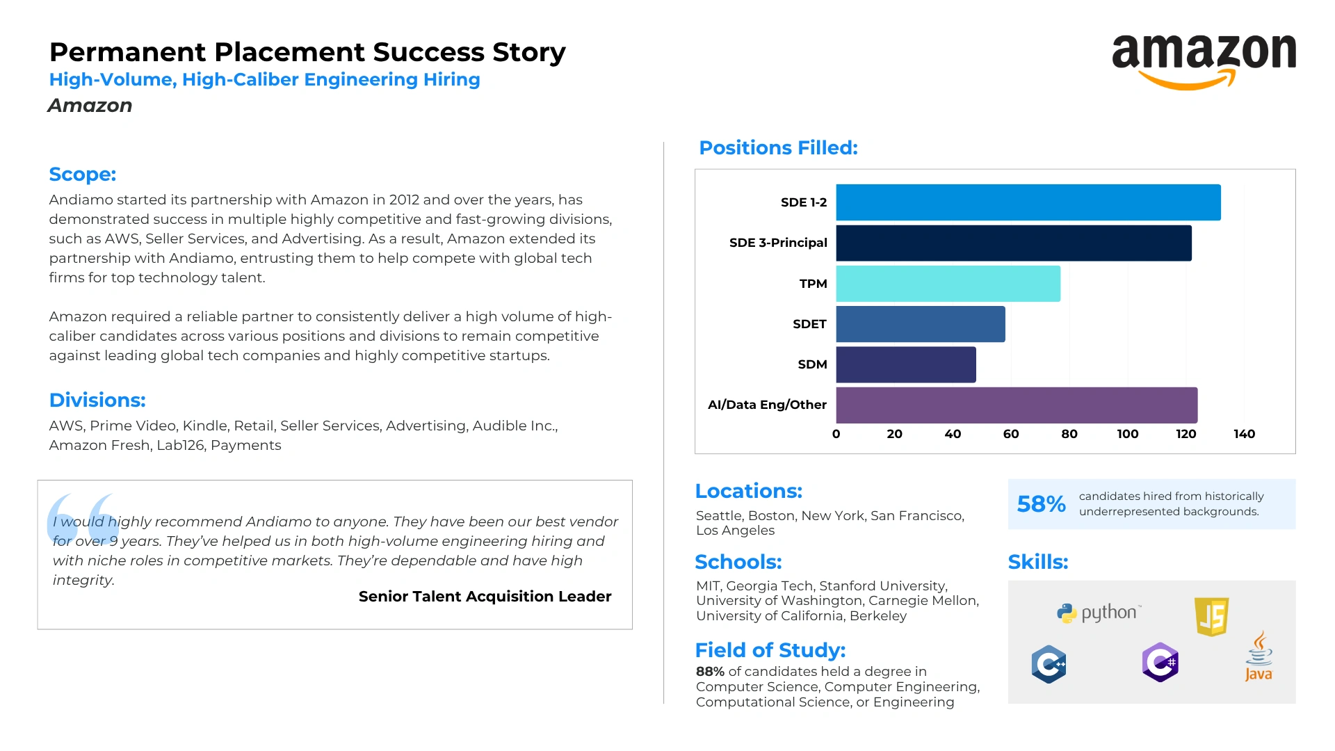 With over 20 years of proven leadership in Executive Search, Andiamo has assisted some of the world’s most renowned companies in building effective and diverse senior leadership teams. Find your next great leader to take your organization to the next level.